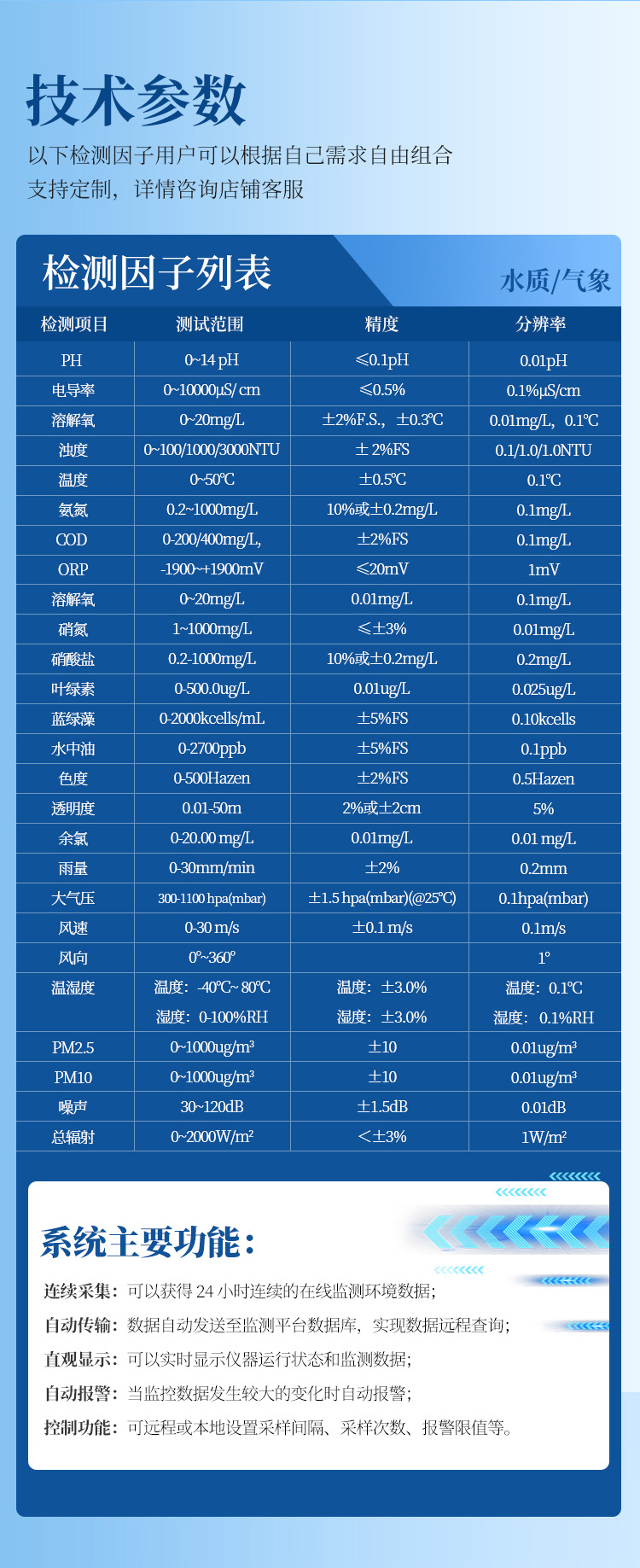 本系統(tǒng)設備主要由以下部分組成: 水質傳感器可選COD 在線監(jiān)測傳感器、氨氮在線監(jiān)測傳感器、PH 在線監(jiān)測傳感器、電導率傳感器、溶解氧傳感器、濁度傳感器、流速、液位等水質.水文傳感器;氣象傳感器可選風速、風向、溫濕度等;;輔助供電系統(tǒng)(太陽能+蓄電池供電)、現場控制、數據采集系統(tǒng),無線發(fā)射儀。